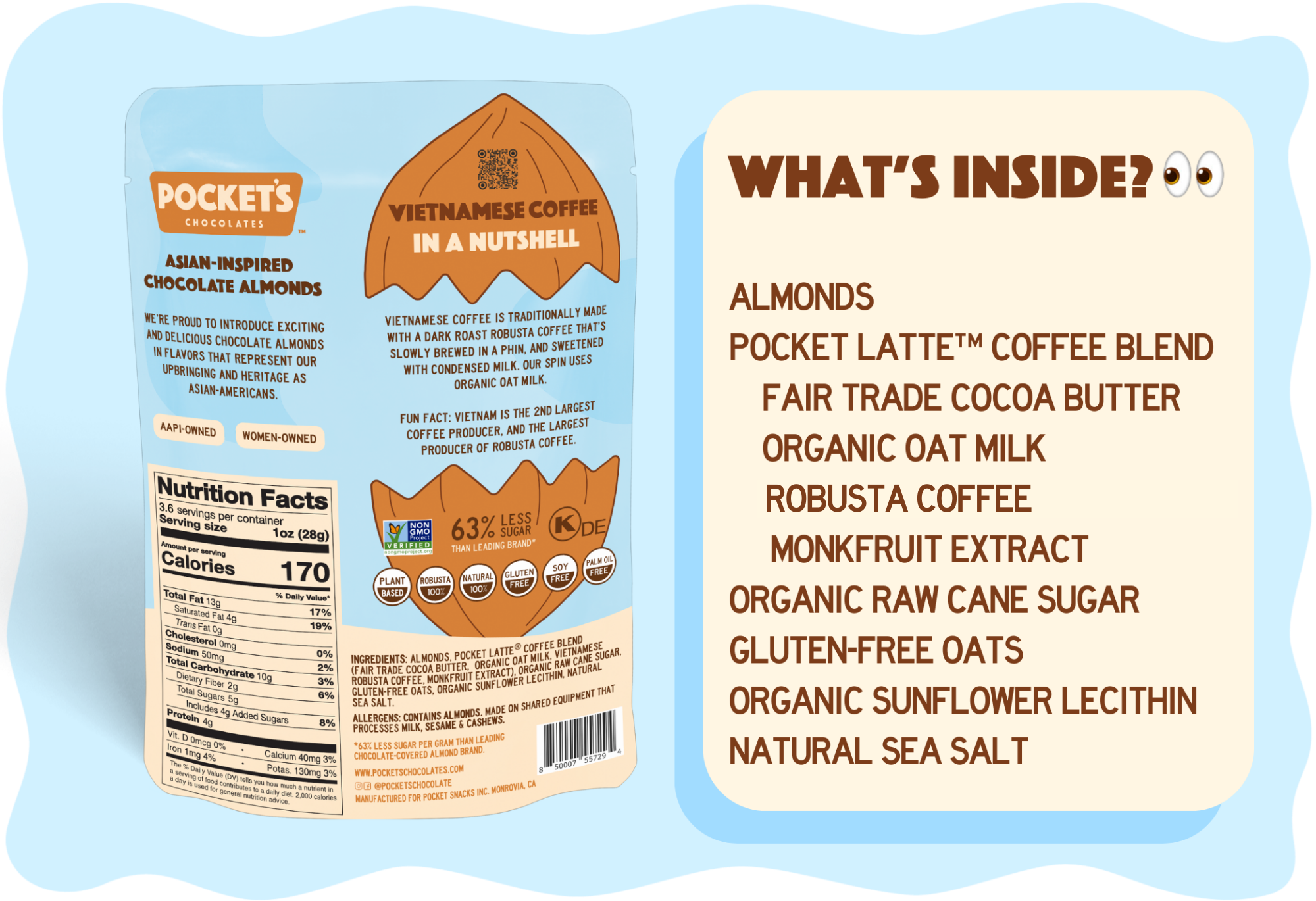 Even though Vietnamese Coffee is traditionally made with condensed milk, out Vietnamese Coffee oat milk almonds are made with oat milk so they're dairy-free and plant-based!